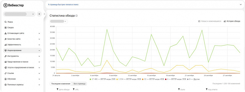 - Яндекс.Вебмастер: раздел Статистика обхода показывает количество проиндексированных страниц и скорость обхода сайта Яндексом.