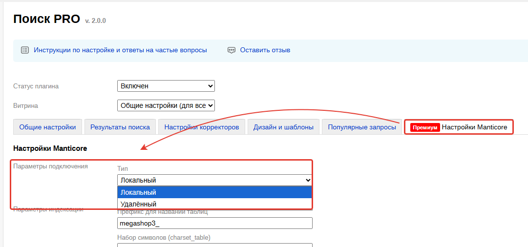 После базовых настроек перейдите в раздел "Настройки Manticore" и выберите параметр подключения: